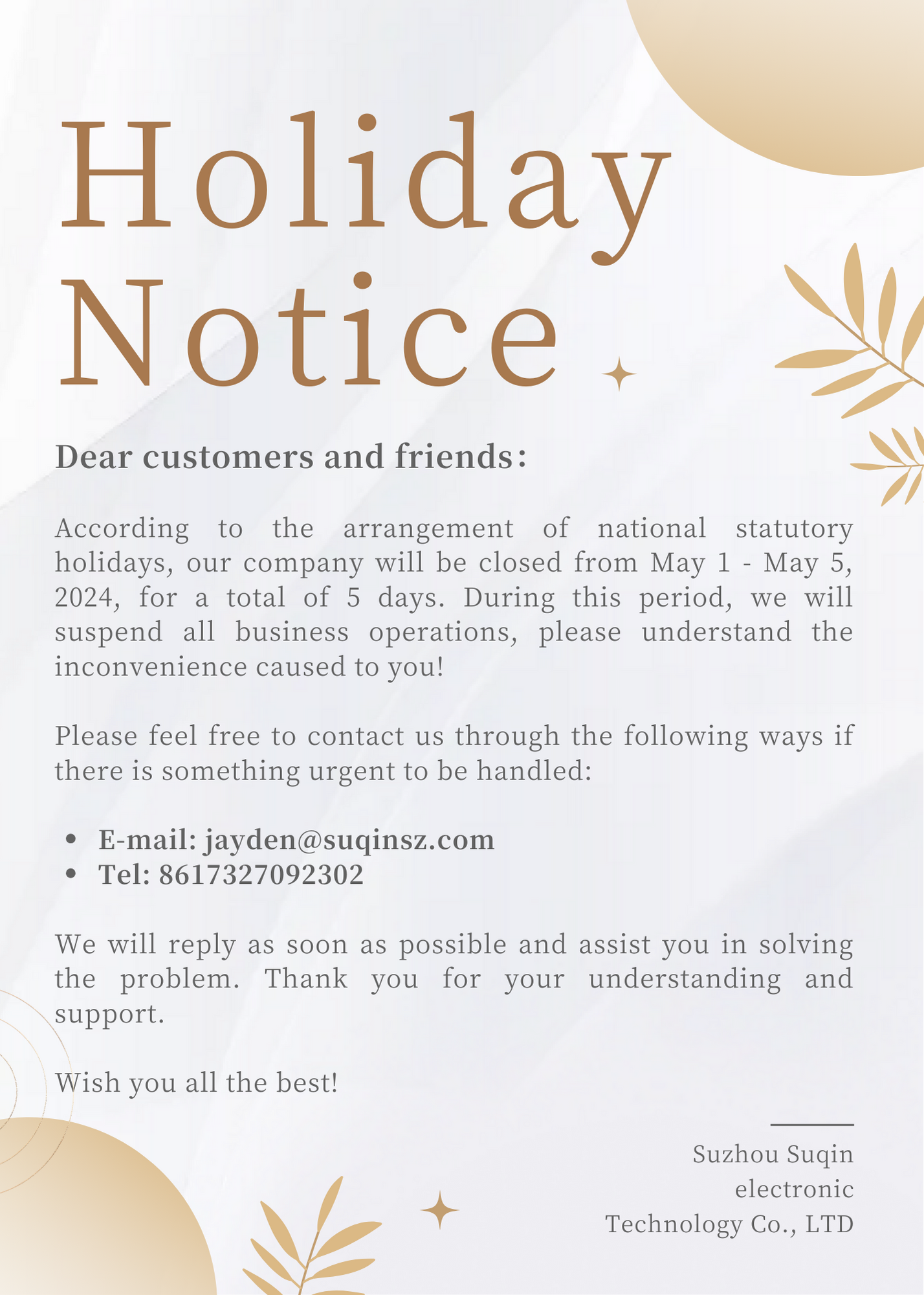 Holiday Notice — International Workers’ Day