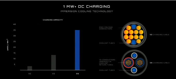 Huawei’s 600KW is somehow on the same level as Tesla’s V4. Considering that the V4 needs to charge the Semi, its power should be at the MW level (1000V&1000A+). From the previous relevant information, we can run through Tesla’s realization, and the external charging port adopts a special “invasive liquid-cooled conductor. The external charging port uses a special “invasive liquid-cooled conductor” to significantly reduce the size and weight while improving charging efficiency, and the high-power interface at the vehicle end will form an active cooling system with the battery cooling system, and the plug-ins on the busbar will be connected more reliably, while the cooling system is loaded with a copper-aluminum conduit to replace the running power line, forming a closed-loop complete cooling link. Huawei has not yet seen the relevant details of the technology announced, I believe that the back will be gradually announced, but then again, little more confidence points to the far ahead of the technology announced, more peers can “progress”.